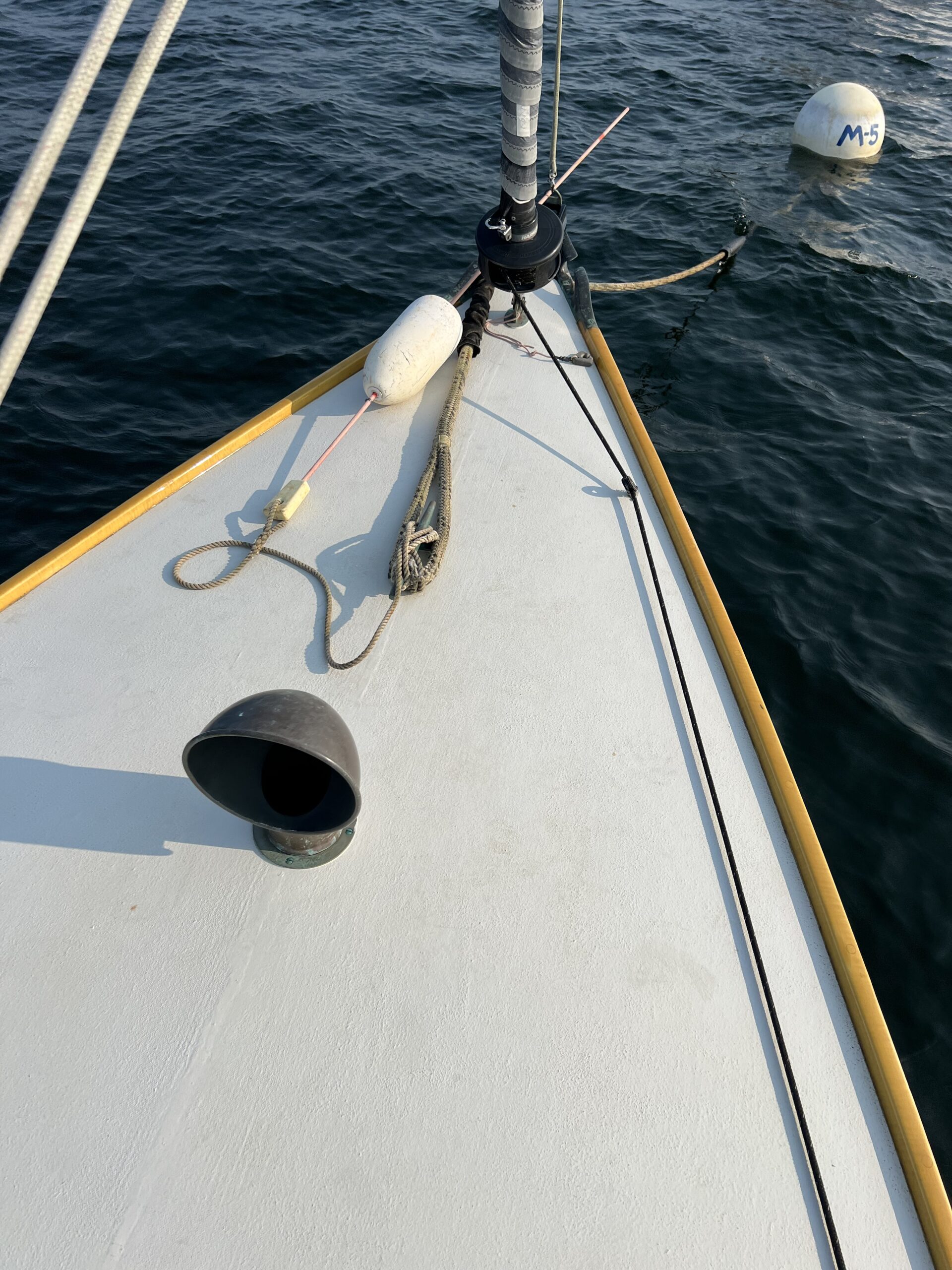 Bow cleat: 10-inch bronze Herreshoff pattern.
