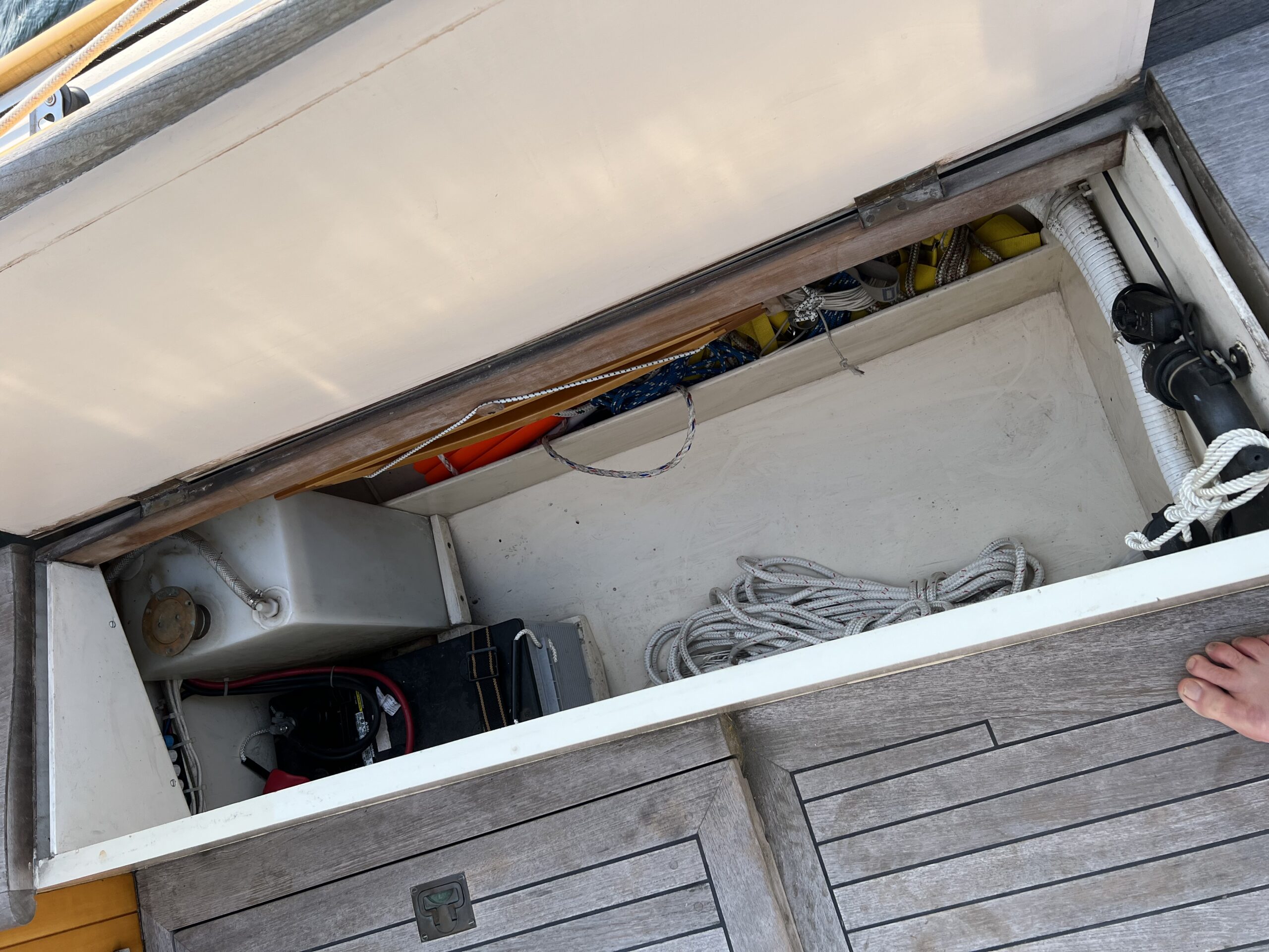 Cockpit is self-bailing with painted non-skid Awlgrip. Engine hatch in forward end of cockpit sole. Four opening cockpit seat lockers offering capacious storage for sails and gear. Waldron footwell sides and cockpit sole of laid teak– storage cubbies outboard of seats for winch-handles and other small gear. Cockpit seats are quarter-sawn teak over laminated cored plywood substarte for stability and light weight, raked and carved to shape for comfortable seating. Curved laminated varnished Mahogany tiller. Lazarette accessed through aft deck hatch.
