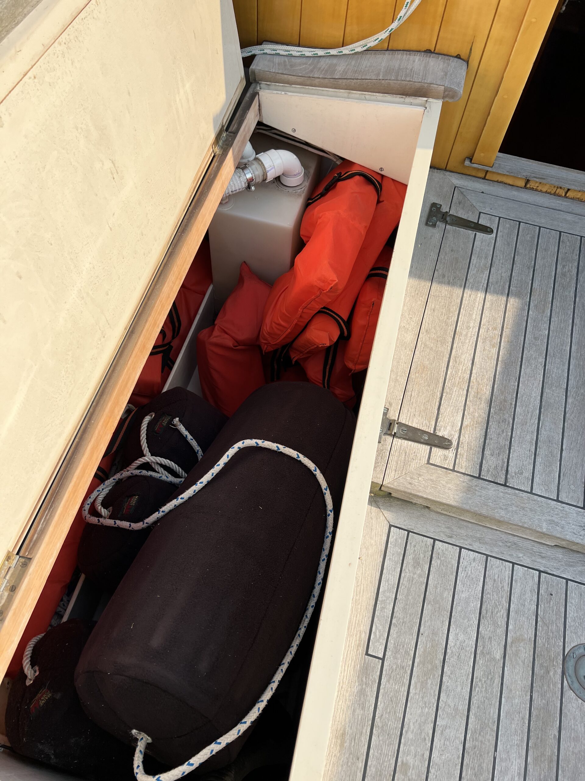Next forward, two upholstered seats face each other, carefully crafted for comfortable sitting, with storage outboard. Forward of the seats is a vee-berth. An open area forward of berth provides space for extra sails and other gear, anchor is located in aft deck locker.