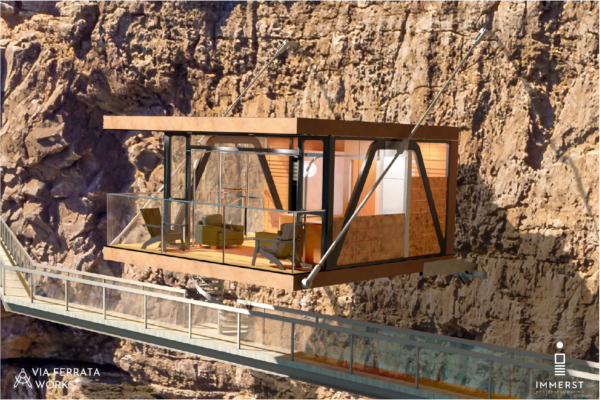 Below, a glass-encased pop-out “fishbowl” bedroom allows guests to watch the moon above or observe a grazing elk below – while wrapped under their covers of a cozy bed.