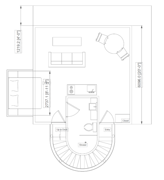 Canopy is designed for short-term stays or long-terming living and it includes an efficient kitchenette and bathroom, which maximize square footage using elegant finishes and innovative cabinetry, inspired by Stephens Waring’s work in yacht design.