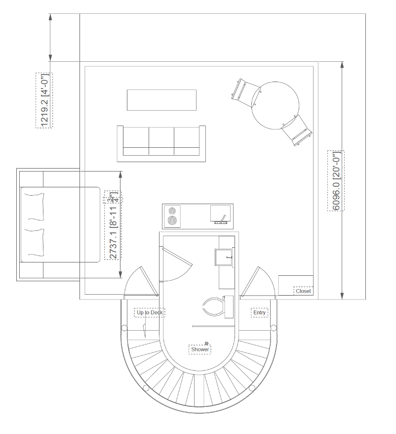 Canopy is designed for short-term stays or long-terming living and it includes an efficient kitchenette and bathroom, which maximize square footage using elegant finishes and innovative cabinetry, inspired by Stephens Waring’s work in yacht design.