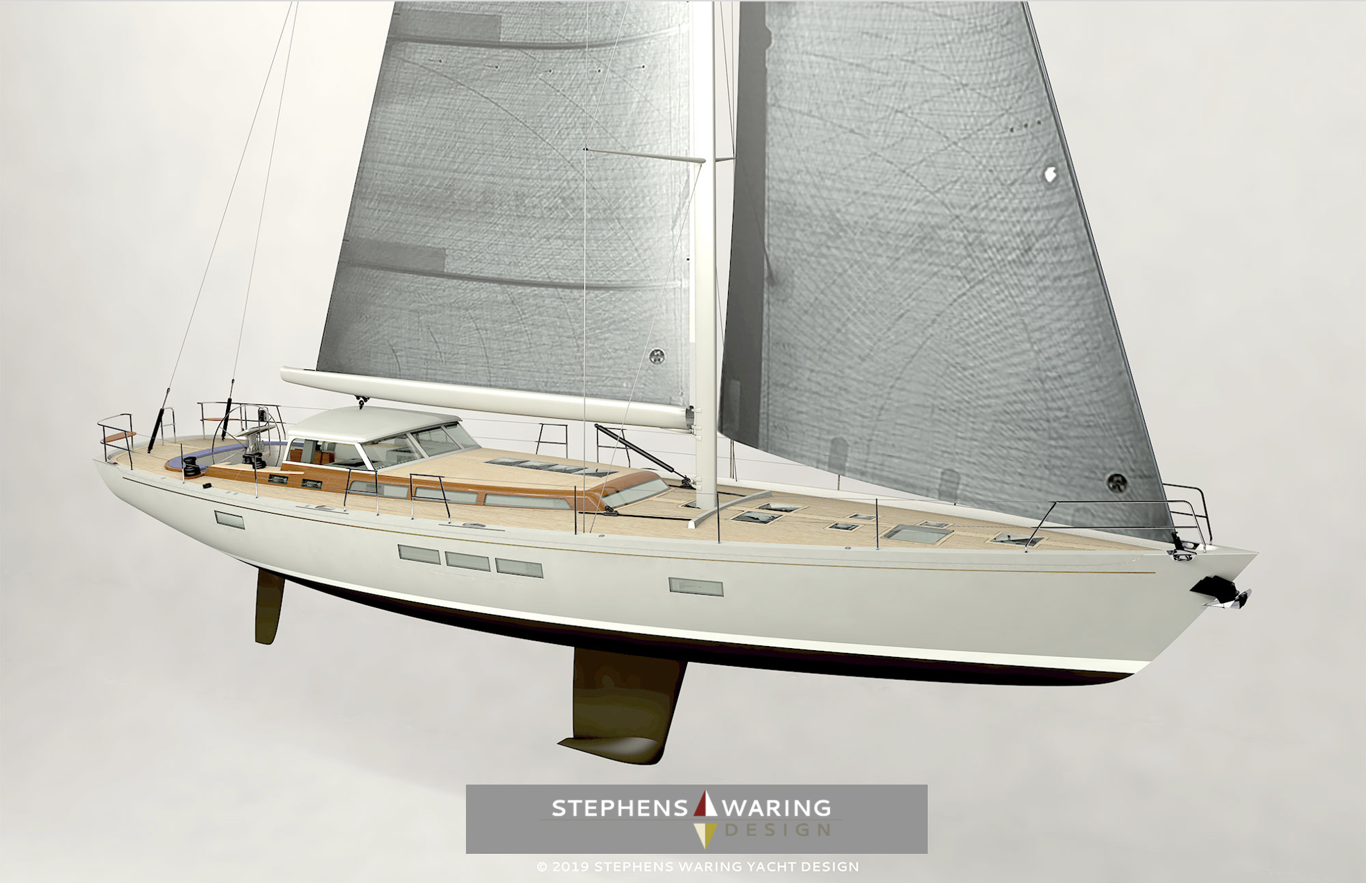 Over time their interest turned toward Spirit of Tradition design, and perhaps doing a bit of SoT racing. Their enthusiasm caused us to explore re-shaping the project into a Spirit of Tradition sailboat. The design brief had evolved from the three-cabin 57 to a four-cabin 63 to allow room for a professional crew while retaining a plumb-stemmed modern style hull and superstructure. When we challenged a new design direction toward SoT by adapting hull and deck style—essentially wrapping a new envelope around the proven interior and machinery arrangements already developed—we liked what we saw. We liked it a lot.