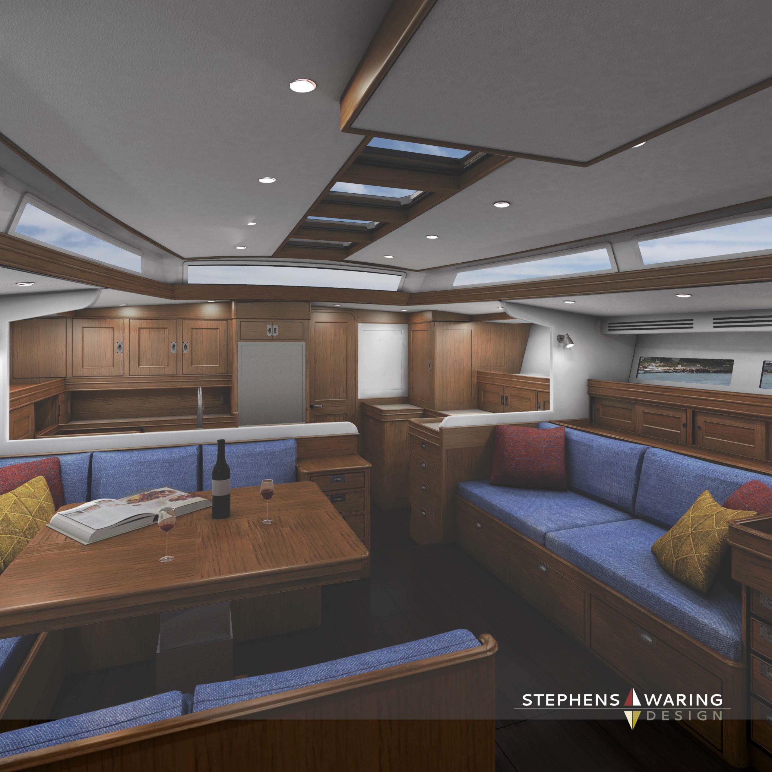 The biggest twist was a shift in the exterior aesthetic of the yacht–originally aimed as a sleek Grand Prix-style Club Racer and taking a 180° turn towards Spirit of Tradition style. Our clients (a husband and wife team) were looking for a big step in luxury and style above their current cruising boat, a sporty 46-foot cruiser from a well-respected US brand. Their eyes had initially bent toward European brand, modern-style yacht—think Solaris, X-Yachts, and Swans—and we initially built a preliminary design for a sleek, spare, modern 57-footer with a plumb stem, wide wedge-shaped hull featuring a hint of a chine in the quarters. These choices would have made a great boat, but fate often takes us in new directions.