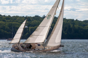 Camden Classics Cup, Day 2: generally solid breeze with holes. Those who could stay in the breeze did well, those who struggled didn’t. Zingara had an unfortunate situation—her asymmetric spinnaker is a cruising chute—small and flat, with perhaps 30 percent less area than a good big racing A2. Worse, the periods when we had little wind, coincided with the periods when we were running with that little sail. We worked hard to compensate with a mizzen staysail, but we lost big ground on the runs. For example, we rounded a windward mark within a couple of minutes of Lyman’s Magic, but at the leeward mark we were at least 15 minutes behind. At the top of the next windward leg, we had an incredibly close port-starboard meeting with Magic again—we made up all that deficit on the weather legs. But it wasn’t enough. We finished sixth out of eight, and there went our hopes to award our own trophy to ourselves! Meanwhile, the top of the fleet included Lynnette, whose skinny, light hull delivered just enough power upwind to allow her slipperiness in the lighter downwind legs to pay off.