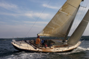 Camden Classics Cup, Day 1: big breeze widely distributed across the racecourse. When the wind blows, the boat with the power to stand up to it is going to do well. This was true for us on Zingara—she is a relatively heavy and under-canvassed cruiser when compared to the bulk of the Spirit of Tradition fleet. Her long waterline gives her space below and a high top speed, but adds to the wetted surface. With strong breeze, she was able to capitalize on the waterline length and stand up well to her sail plan. We finished second, behind Drew Lyman aboard his Seguin 44, Magic, also a fairly heavy cruising boat. Lighter, narrower boats, like Steve White’s, Vortex, and Lynnette, an Eggemoggin 47 (hull from Bob’s drafting table when at Brooklin Boat Yard) struggled to hold up their sail plans and slipped behind.