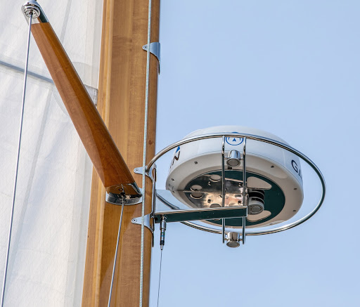 The fabrication combines the steaming light, tucked just under the radar, and is fitted with deck lighting for illuminating the working conditions on deck while sailing at night. Placing the array overhead up near the first spreader gives good sight-lines for those foggy day scans where extended ranges are needed.