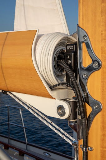 A notable feature to the spar speaks to the implementation of a line clutching system that is new(ish) to the sailing world. Ronstan recently launched their Constrictor product, a ‘textile rope clutch’ aimed at solving a common challenge onboard sailing vessels: halyard stopping.