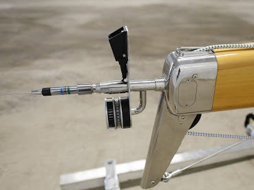 Simple elliptical sections were employed when carving the lengths of solid spruce that makes up each of the 4 spreaders. This is a small refinement to the more conventional rectangular section of spreaders found in the 40’s era, yet not an entire leap to a foil shaped spreader that may be found in modern times. This lends a softer look and more enhanced shape to the hand, and gives some further efficiencies to the spreader. This shaping is carried out to the tip fitting that retains the terminal cup hardware seen installed on more typical modern composite spars.