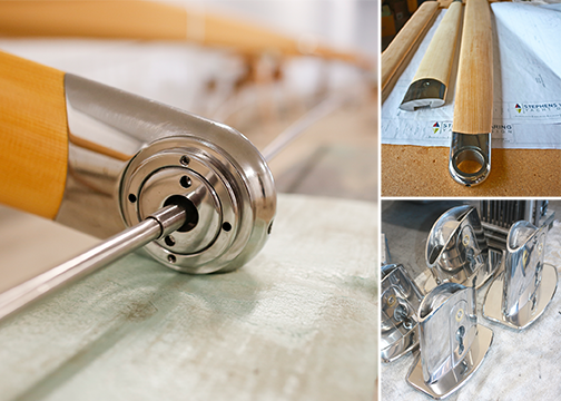 Two of the more unique pieces of hardware concepts seen on this mast, the spreader tip and root fabrications, work deliberately to save weight and streamline the attachment of stays in a beautifully crafted piece of stainless.