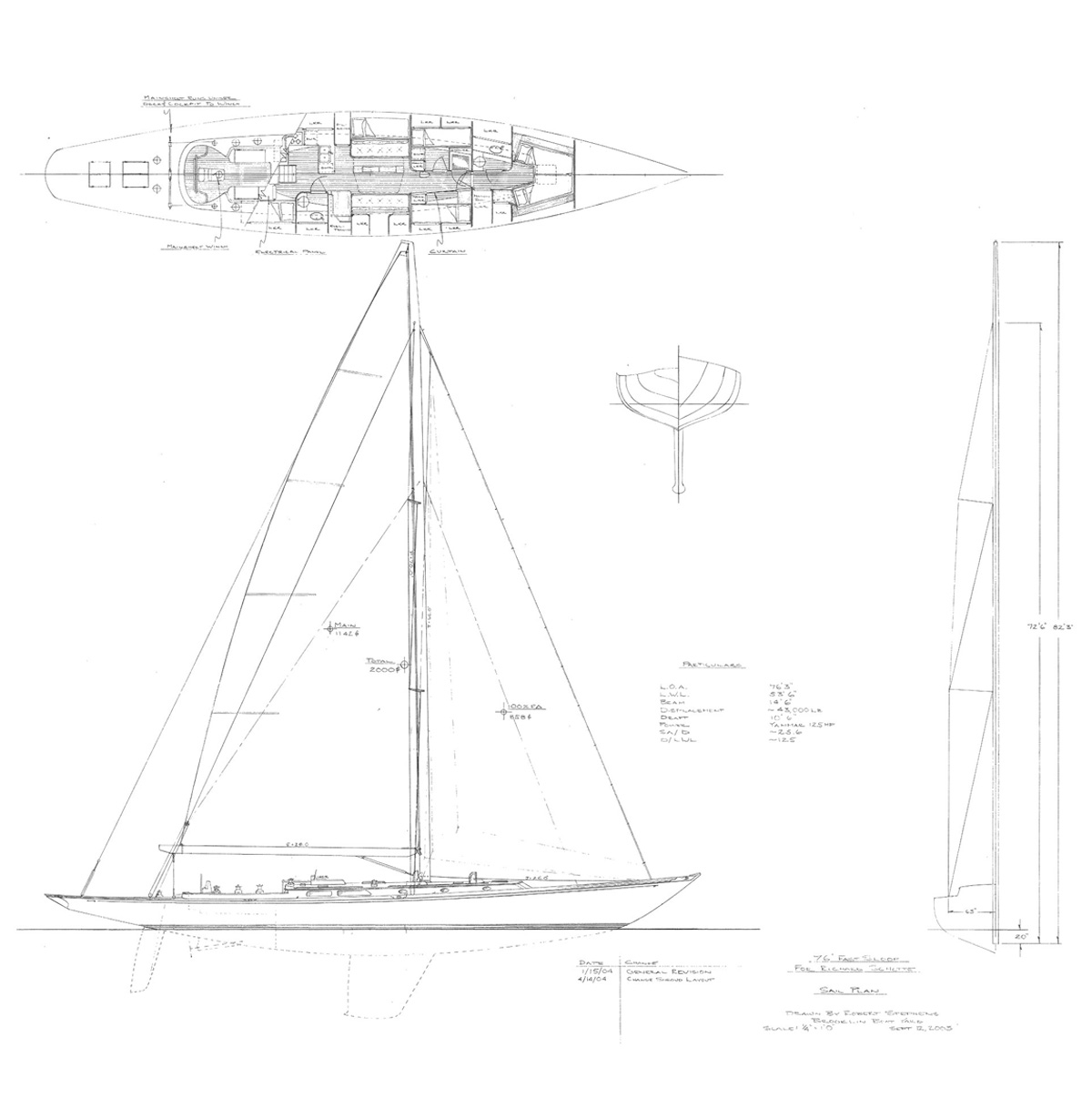 We would harvest serious modern performance with slick underwater foils and a low-wetted surface hull, tweaked to handle the bad-breaking big lake seas. And to keep costs down, we would also experiment with the right balance of wood, foam and carbon to make the boat affordable, yet light and stiff. We probably would add some free-board to keep the boat dryer and open up space below. Race or cruise, if you are going to build to 75-plus feet, you should least enjoy all that room.