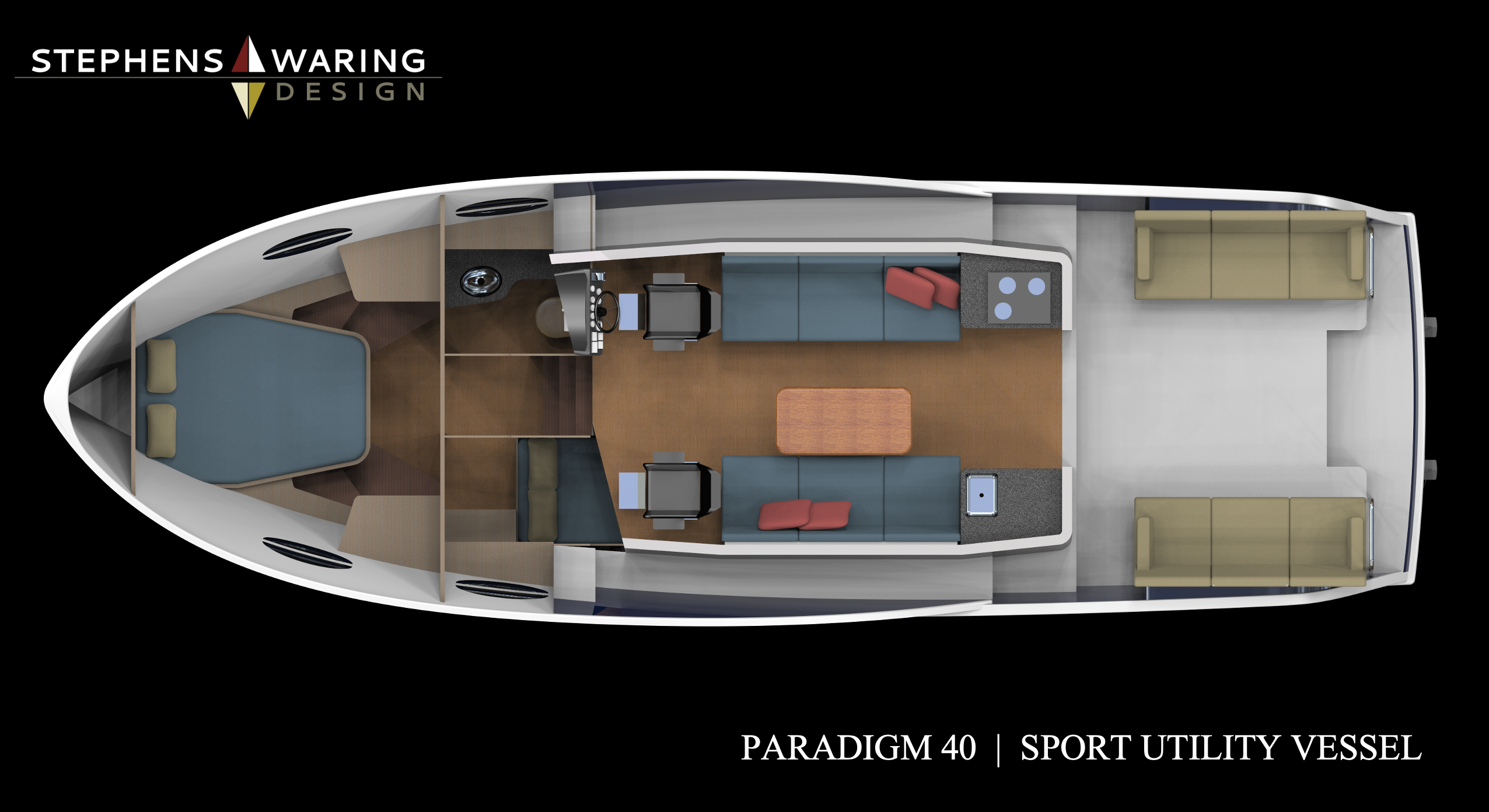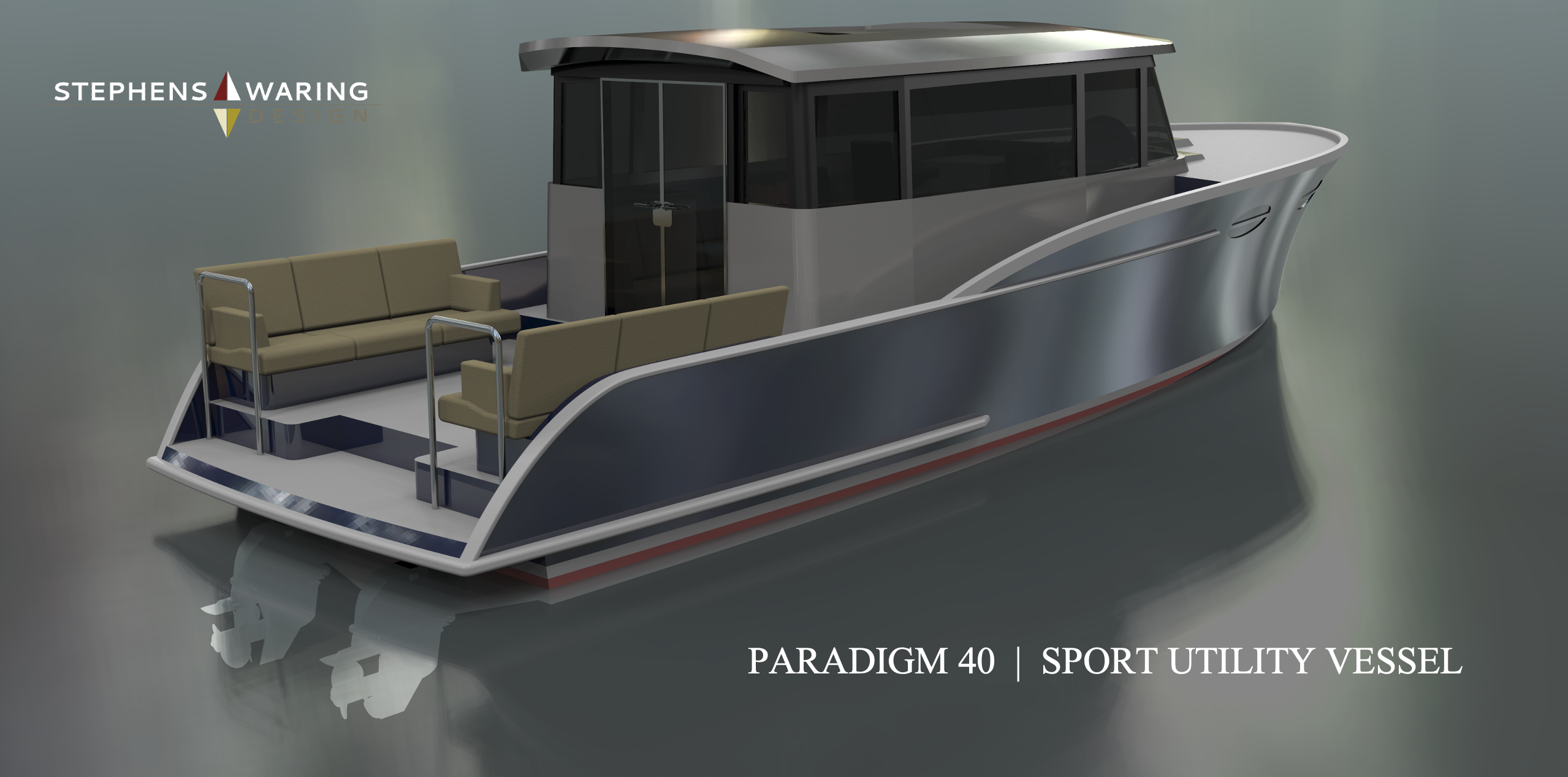 The Paradigm 40 Sport Utility Vessel offers roomy comfort for social gatherings and family time shared together. The platform design offers flexibility in configuring decks for focuse use whether water-sports or socializing is the goal. The boat arranges privacy and comfort for two couples, or a family of four, and safety and utility beyond comparison.
