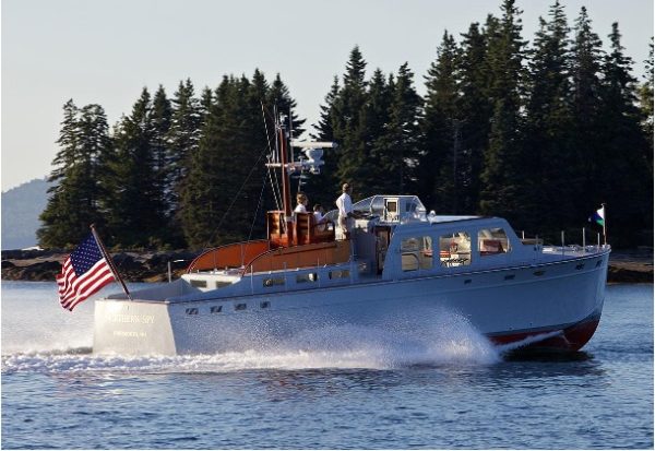Stephens Waring worked with the owner of this classic 45’ Huckins, called Northern Spy, to rebuild the hull structure to accept the most modern of power plants: twin Volvo IPS drives. In the classic Huckins QuadroConic hull form, the IPS performs marvelously, boosting speed, cutting fuel consumption, and increasing maneuverability. Photo credit: Alison Langley