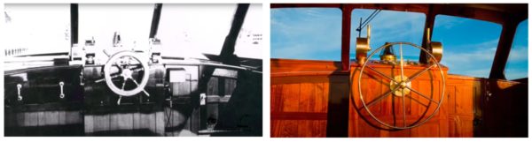 The bridge of Aphrodite was restored to match the original materials and controls of the vessel. Materials including varnished mahogany were carefully matched and rebuilt based on the original design specifications. Right image photo credit: Benjamin Mendlowitz