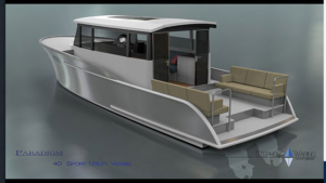 Speaking of the kids, the internal volumes on Paradigm make for an absurdly great family yacht. How glorious is to consider the open deck space for the kids to live their own boating dreams. Think water toys– that wide-open afterdeck works like a pickup-truck bed. Their junk is over their. Yours is over here. The grown ups enjoy a party and their books. There’s enough space and features to handle a reasonable light cruise or weekend stays as a second floating home down in your harbor of choice. The layout uncluttered and spacious. There aren’t the ergonomics to finesse with working the lines that work sails. We revel in that. There’s room to carry gear or a set of arm chairs. Flexible space is the solution for a motor-driven cockpit and salon. So let’s be flexible.