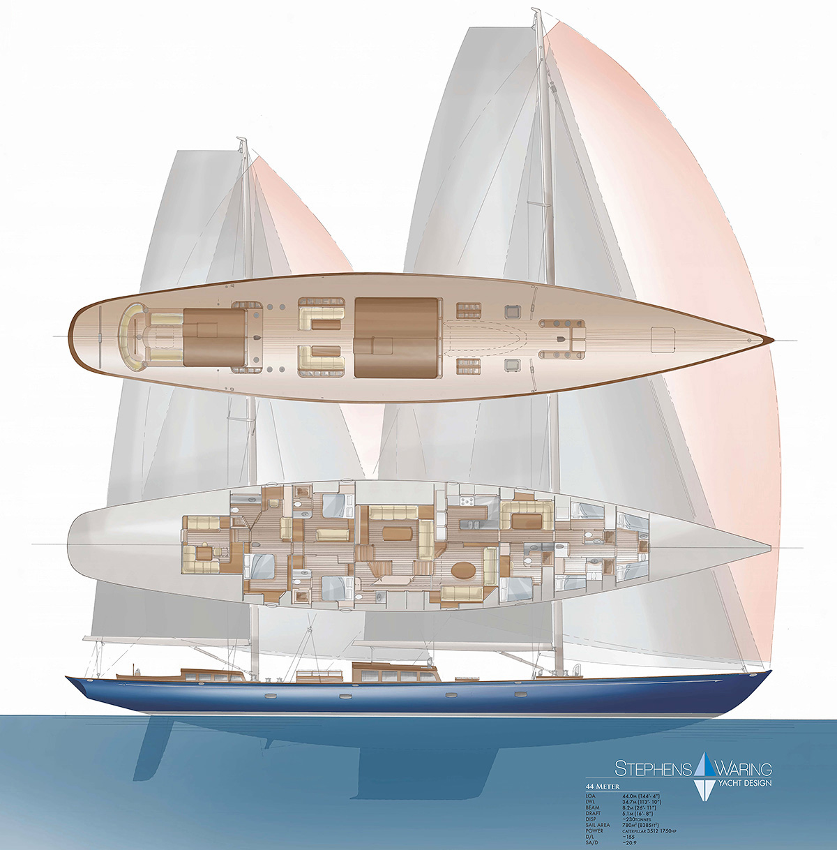 Style, proportion, and spirit of tradition make Anthem a yacht of distinction. She’s designed for extended family cruising or aggressive charter programs supported by a professional crew. At a mere 230 tons, her long overhangs and delicate sheer describe a hull form that could make any predecessor of traditional hand jealous. Anthem will gracefully make her way to any destination without compromising racing performance. She features a seamless blending of indoor and outdoor elements. There are two focal points where interior comfort and outdoor accessibility meet via raised salon seating and cockpit arrangements at mid‐ship and aft locations—each raised salon provides sweeping views under sail or at anchor, a flood of natural light, and wonderful communication with the cockpit. Offshore, the aft salon provides shelter for watch standers and a huge navigation area; inshore, it’s a private aerie for the owner’s stateroom. Down below are three lounge areas in the main accommodation as well as ample space and privacy for the fulltime crew.