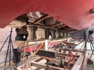 After carefully excising a portion of the bronze keel support structure it is carefully lowered out of the hull leaving wood frames (ends visible) and the bronze engine beds (not visible) to be blended with the new composite keel structure ©Tyler Eads